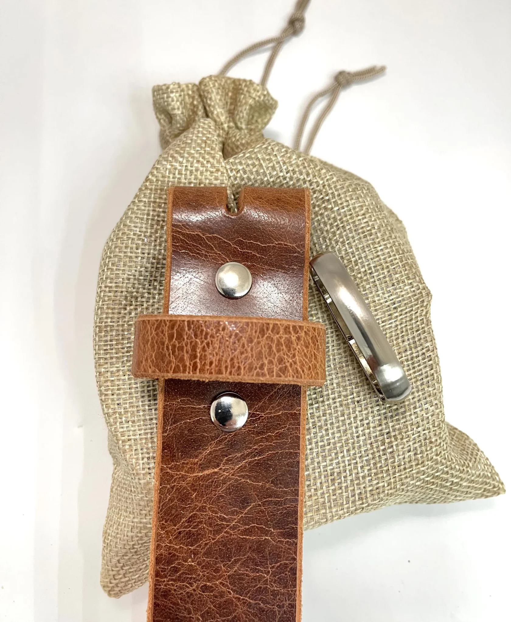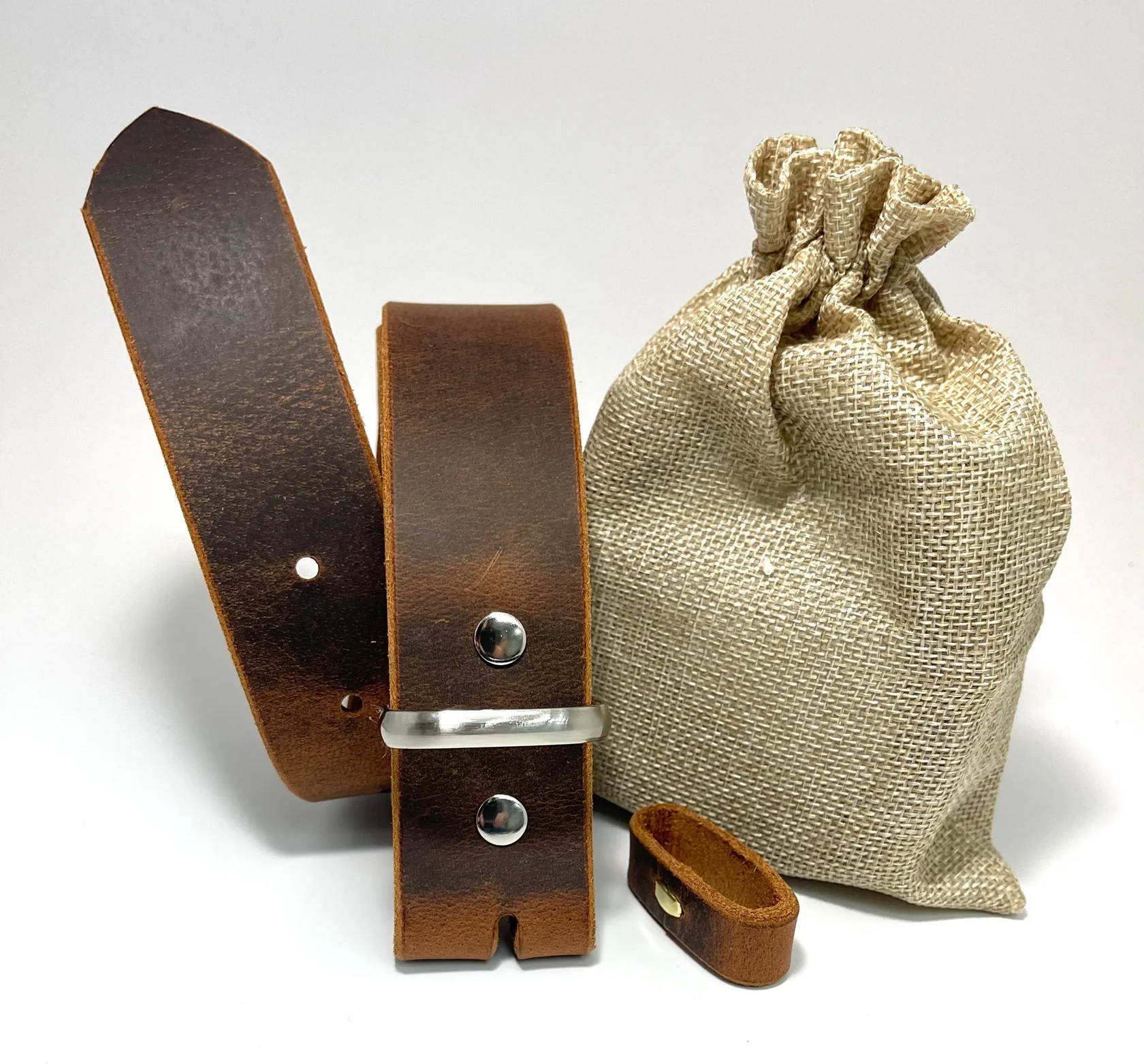 Custom-sized premium belt strap Installed metal & leather keepers Chicago screws for your buckle Canvas storage/gift bag Leather care sample Care instructions Warranty documentation